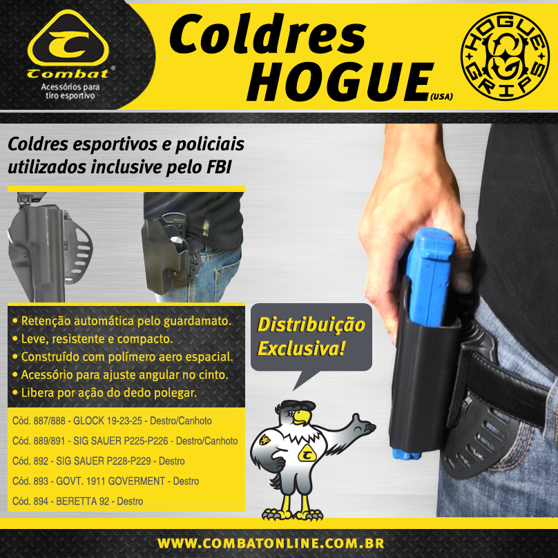 APLICAÇÃO: O sistema de retenção automático “Powerspeed” da Hogue é extremamente seguro e discreto, permanecendo oculto atrás do coldre. Este moderno mecanismo patenteado pela empresa americana permite um movimento natural, de um estado de bloqueio total até um eficiente saque rápido. Cabe a você escolher a posição em que deseja ajustar o coldre, saque em linha reta para cima, em cruz, etc. O coldre Hogue é utilizado inclusive por agentes do FBI.