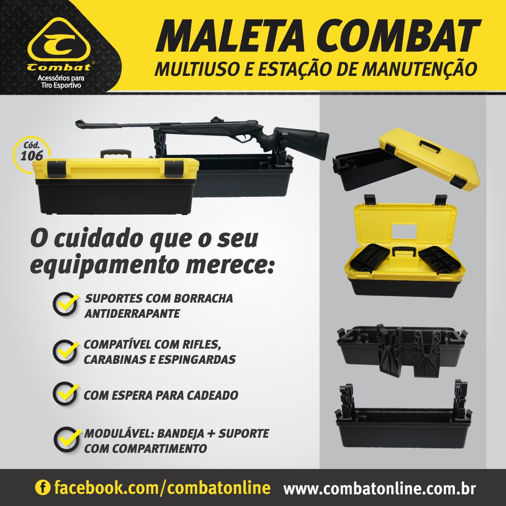APLICAÇÃO: Maleta multiuso com apoio para manutenção. - Suportes com borrachas antiderrapante;- Compatível com Rifles, Carabinas e Espingardas;- Com espera para cadeado;- Modulável: Bandeja + suporte com compartimento.